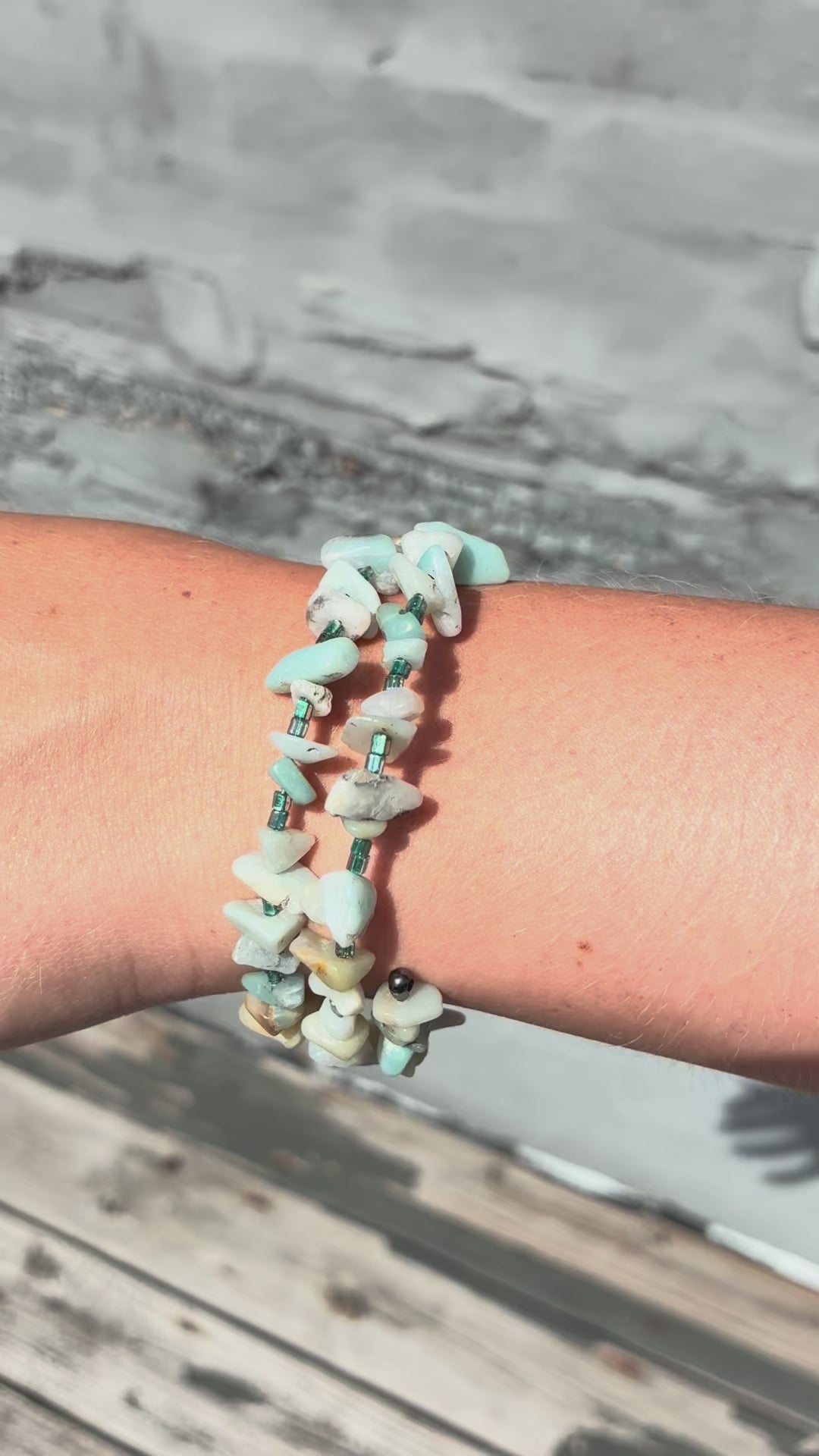 This stunning jewelry set is perfect for summer! The set features a captivating stacked wrap bracelet adorned with vibrant Amazonite gemstones and delicate gold-plated beads. The set is completed with a pair of elegant drop earrings featuring shimmering Amazonite gemstones and sparkling crystals, also with gold-plated findings.