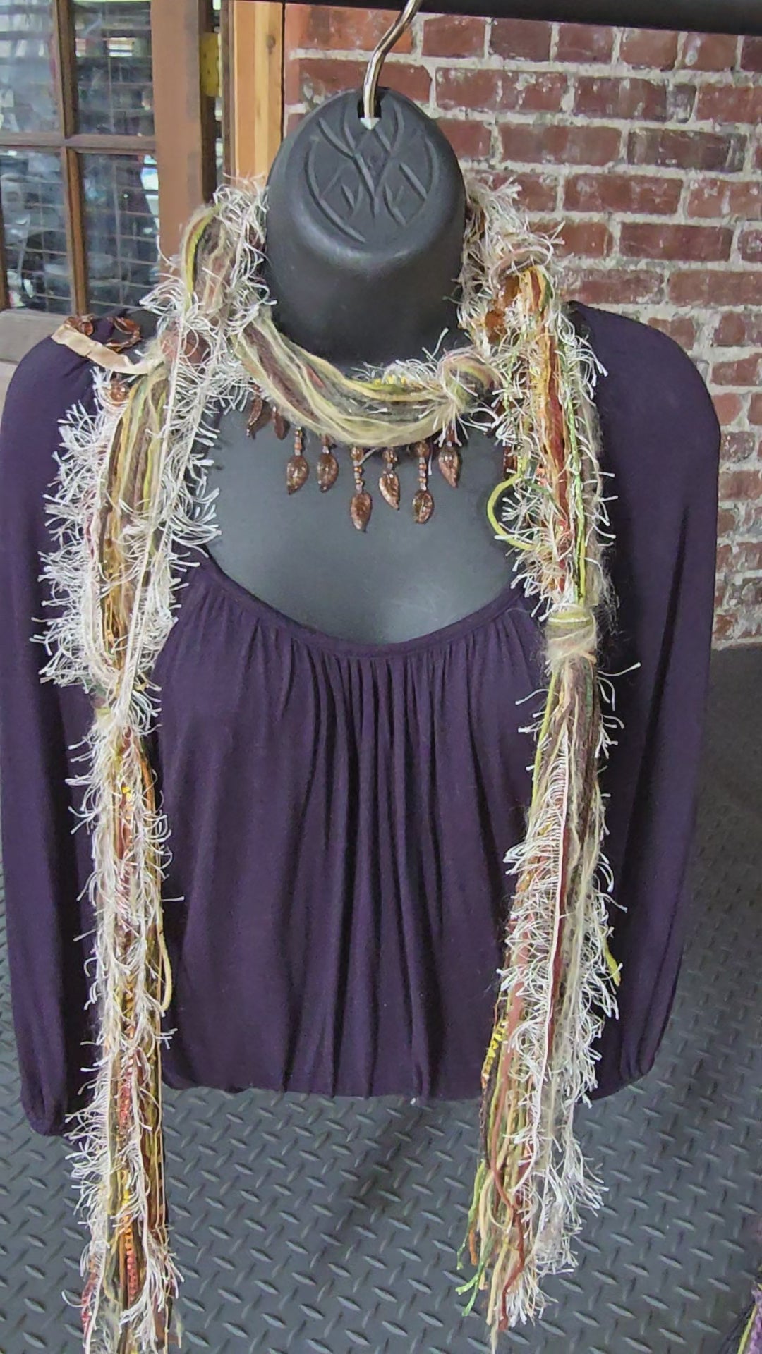 These beaded scarf necklaces are made with Italian silk yarns and mohair and other yarns. A great accent for your summer wardrobe. They are lightweight and comfortable to wear. Measuring 48 inches in length. A mix of brown, green and ivory with brown leaf shaped beads.