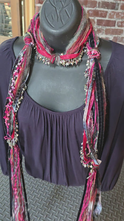 These beaded scarf necklaces are made with Italian silk yarns and mohair and other yarns. A great accent for your summer wardrobe. They are lightweight and comfortable to wear. Measuring 48 inches in length. A mix of Hot Pink and Black with Silver Metallic Beads.