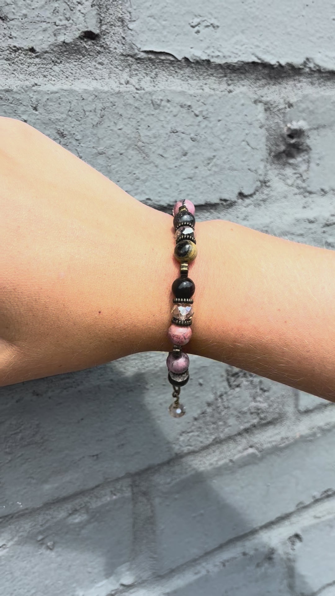 - Features a beautiful combination of rhodonite and crystal beads