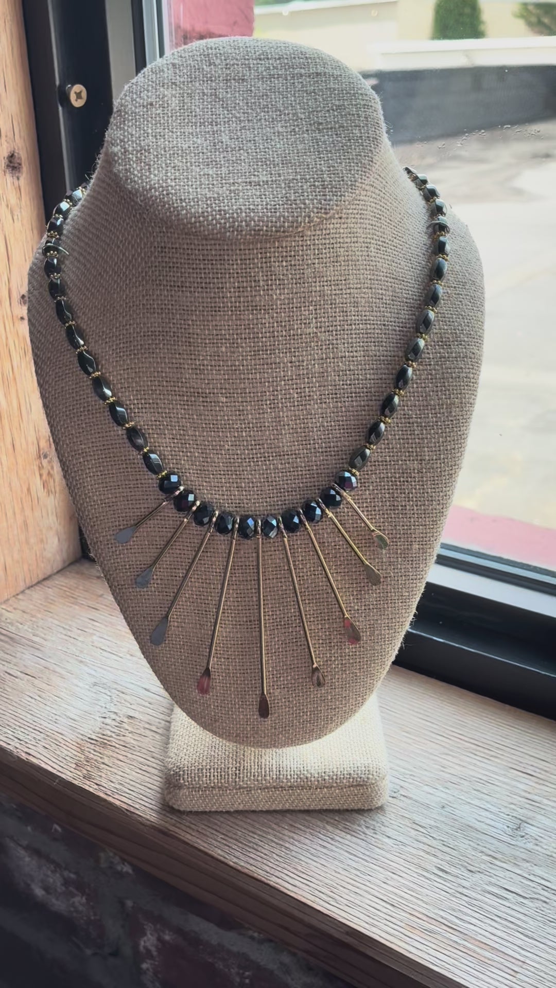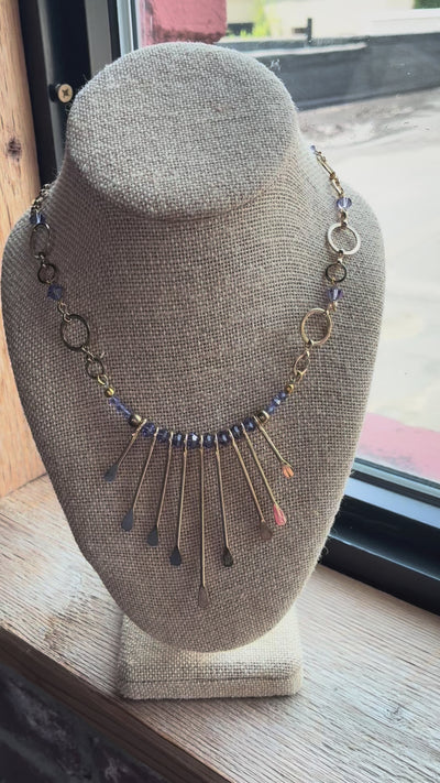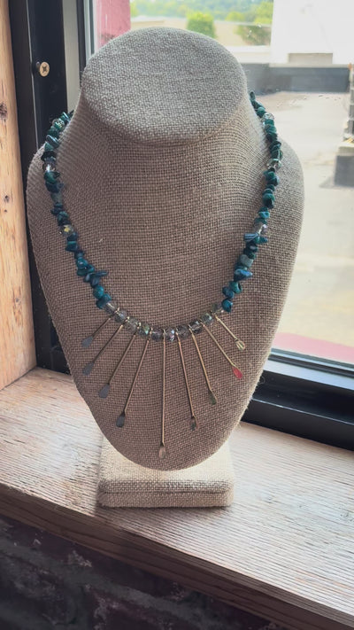 This stunning statement necklace is a bohemian dream! It features a captivating mix of stones and crystal beads, beautifully strung on gold-toned hardware. The unique design with its cascading beaded fringe adds a touch of boho chic to any outfit.
