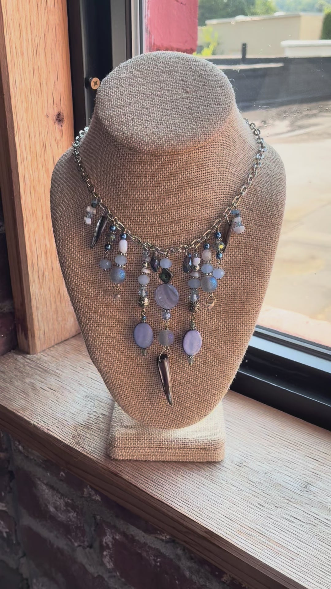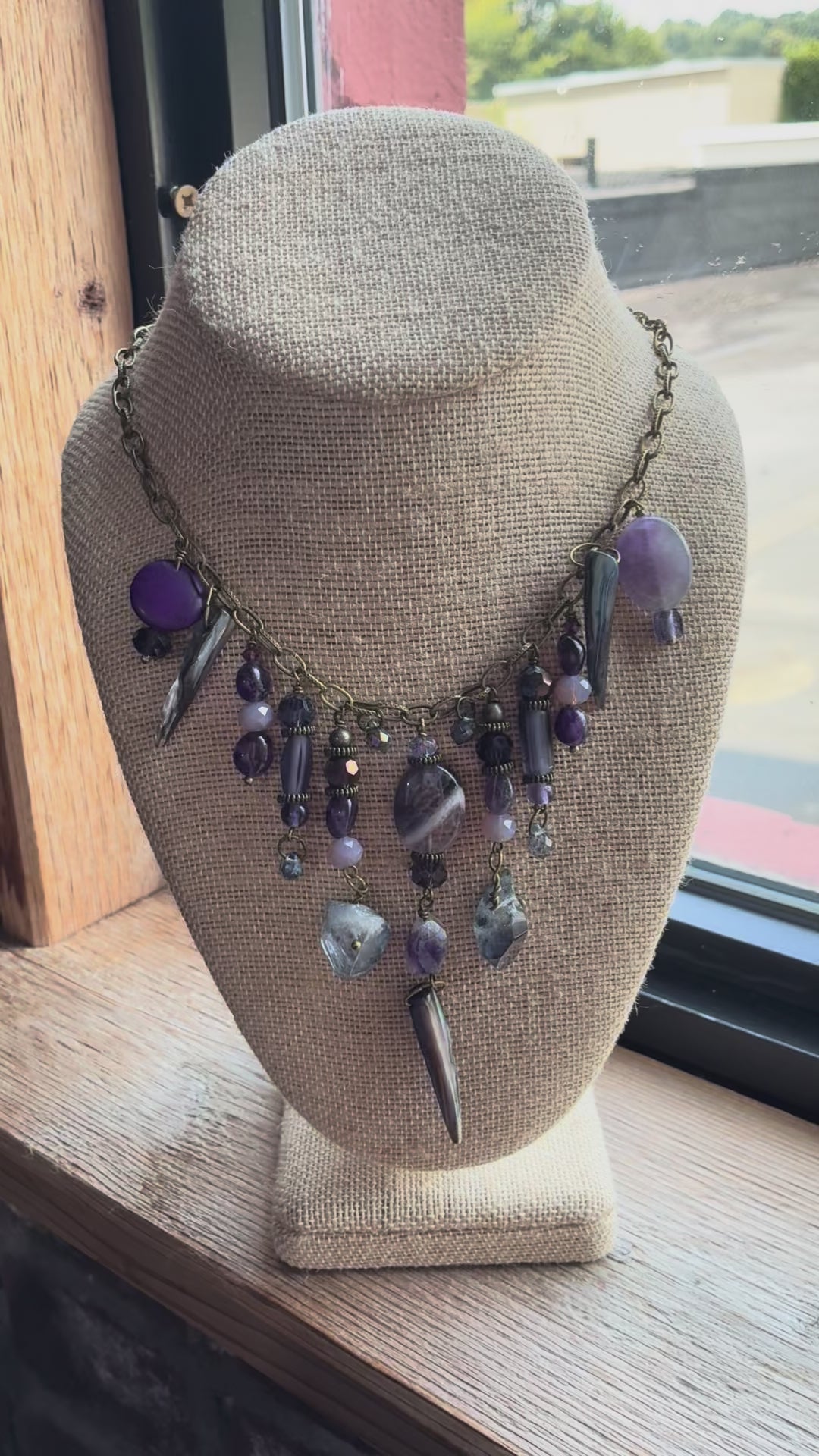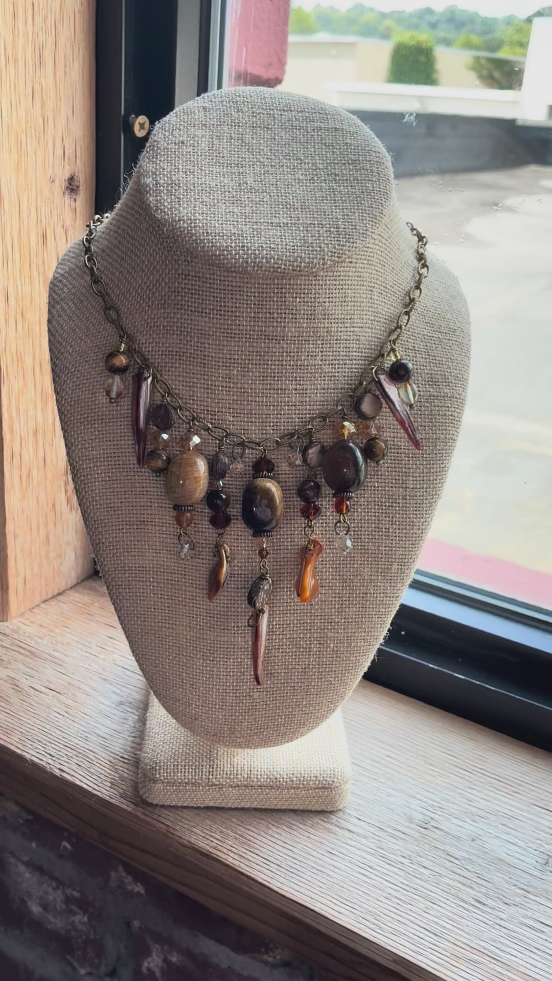 Discover a magnificent collection of cluster bib necklaces, where the raw beauty of natural stones meets exquisite craftsmanship. Each one-of-a-kind piece is a symphony of color and texture, featuring a dramatic bib-style silhouette intricately adorned with a rich variety of gemstones, crystals, and shells. From the earthy elegance of Tiger Eye to the celestial blues of Sodalite and the vibrant purples of Amethyst, these necklaces are designed to make a powerful statement. Expertly assembled on either an antique gold or stainless steel chain, they are the perfect way to express your unique style and add a touch of natural splendor to any ensemble.