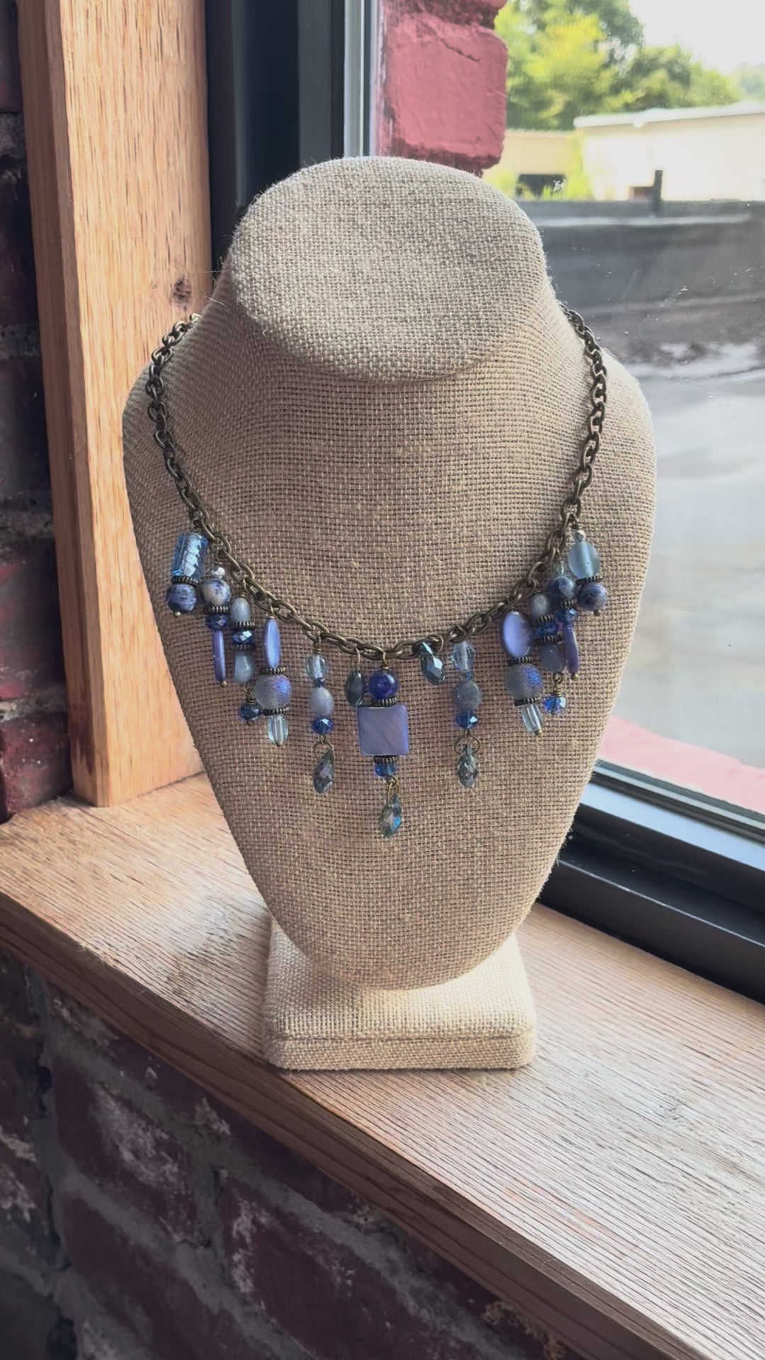 - Sodalite: Includes Sodalite stones, Blue Druzy spheres, dyed blue shell, blue matte sea glass beads, and royal blue crystals on an antique gold chain