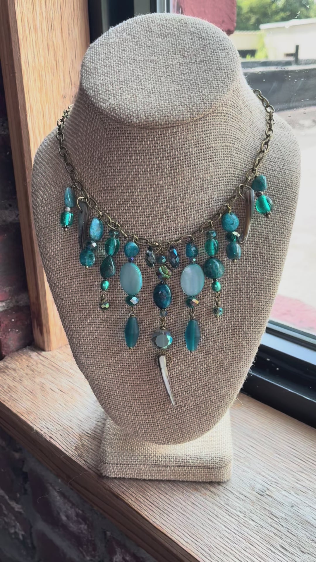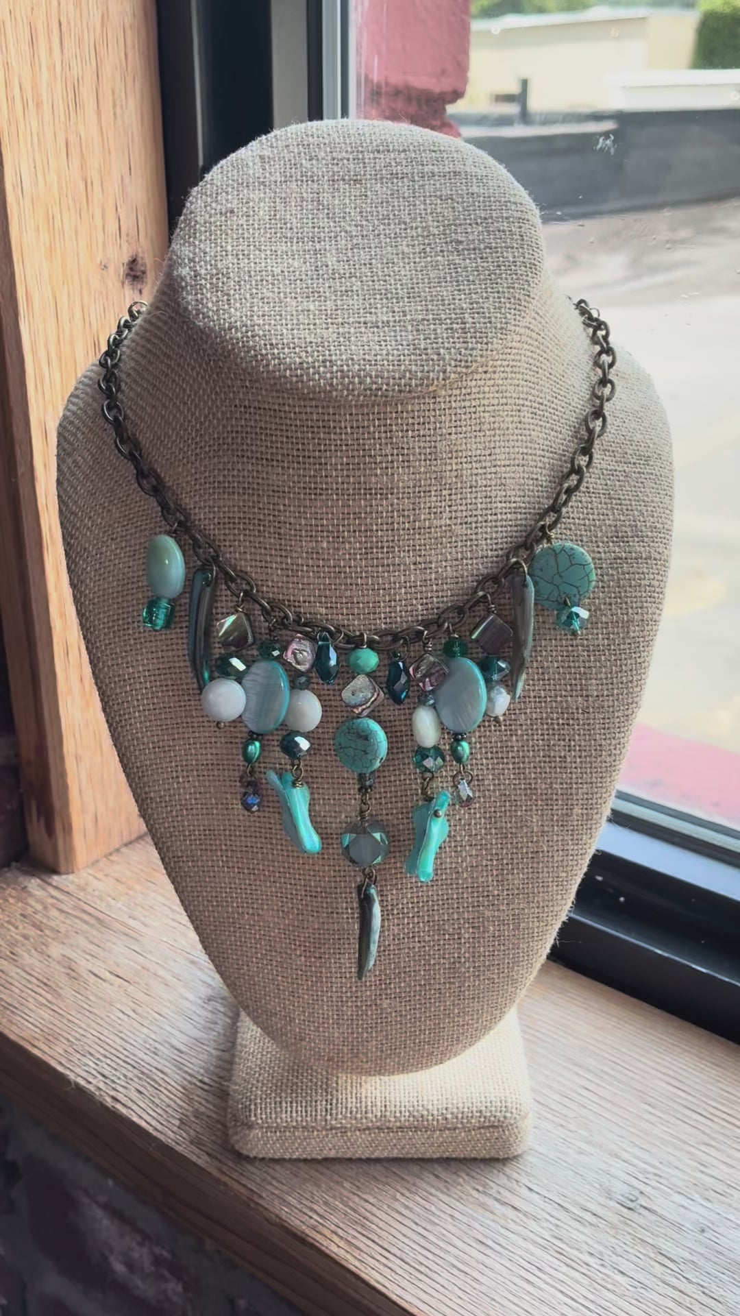 - Turquoise Amazonite: Includes Turquoise, abalone shell, teal tusk shells, Amazonite, turquoise crystals, and matte sea green beads on an antique gold chain