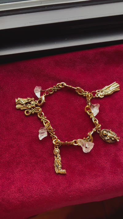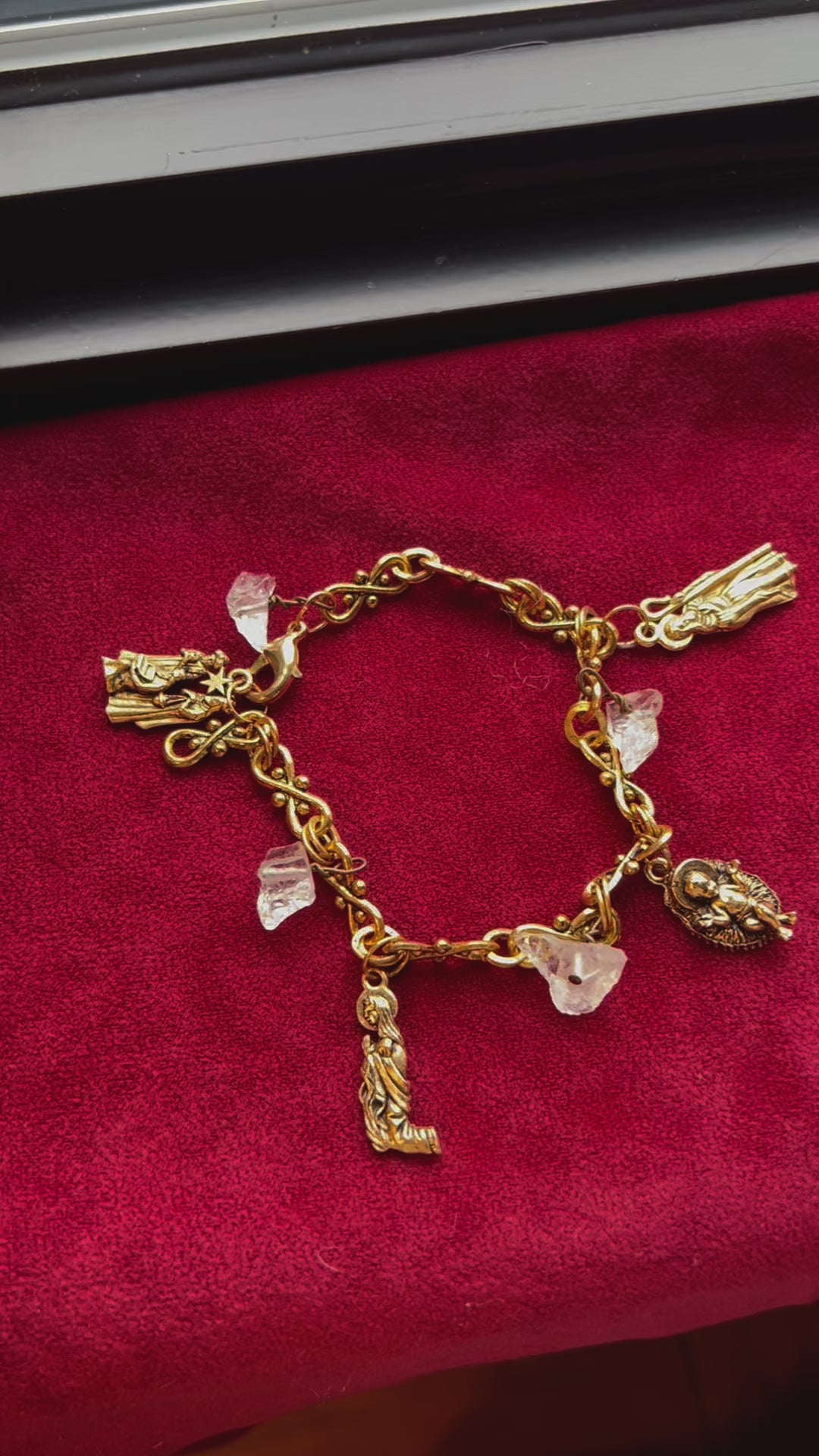 This handmade nativity charm bracelet is made with gold plated pewter charms and alloy metal chain. It is adjustable from 7" to 8.25 inches with a lobster clasp. One size fits most. Made with crystal quartz gemstone. .