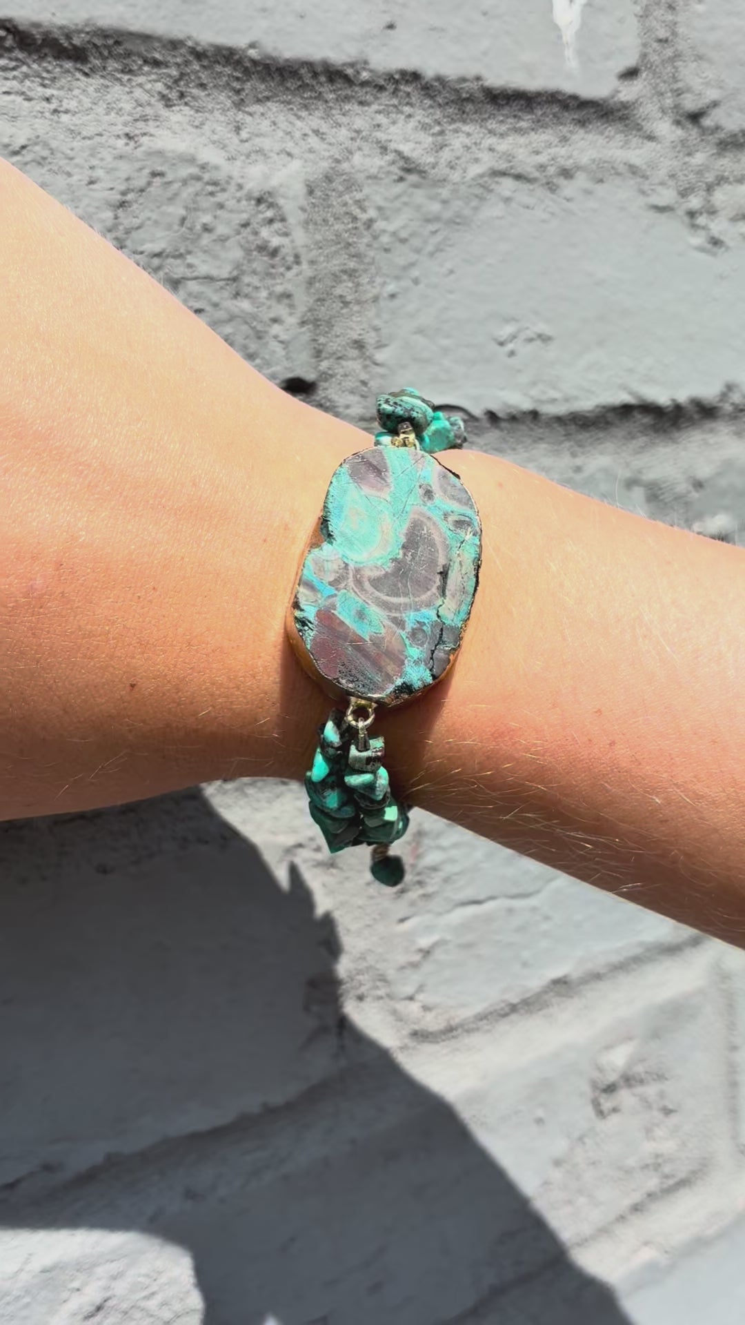 This eye-catching double-strand bracelet showcases the unique beauty of ocean jasper and crazy lace agate. The large ocean jasper cabochon, with its distinctive orbicular patterns, is the focal point. It's complemented by two strands of smaller crazy lace agate beads, known for their intricate banding and swirling patterns. This bracelet is perfect for adding a touch of natural beauty and bohemian flair to any outfit.