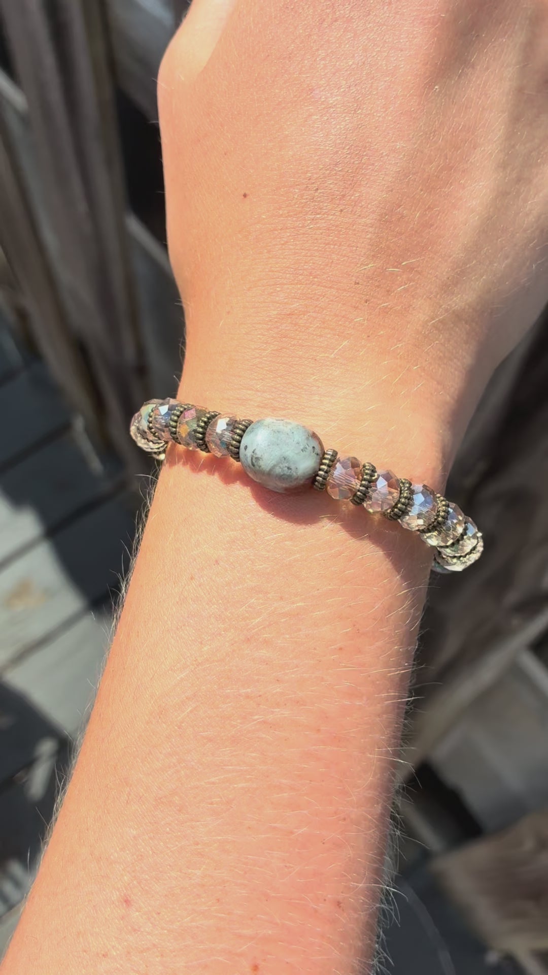 This elegant bracelet combines the earthy beauty of ocean jasper with the sparkling brilliance of faceted crystals. A smooth, round ocean jasper bead serves as the focal point, complemented by strands of smaller, faceted crystals that catch the light beautifully. This bracelet blends natural textures with refined sparkle, making it suitable for both casual and dressier occasions.