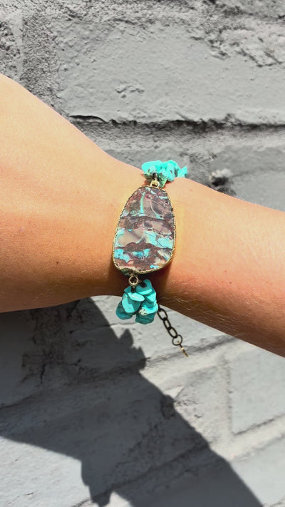 This vibrant double-strand bracelet showcases the unique beauty of ocean jasper and turquoise. A large ocean jasper cabochon, known for its orbicular patterns and earthy tones, serves as the centerpiece. It's complemented by two strands of smaller turquoise beads, adding a pop of bright blue. This bracelet brings together earth and sky, creating a visually appealing and meaningful piece.