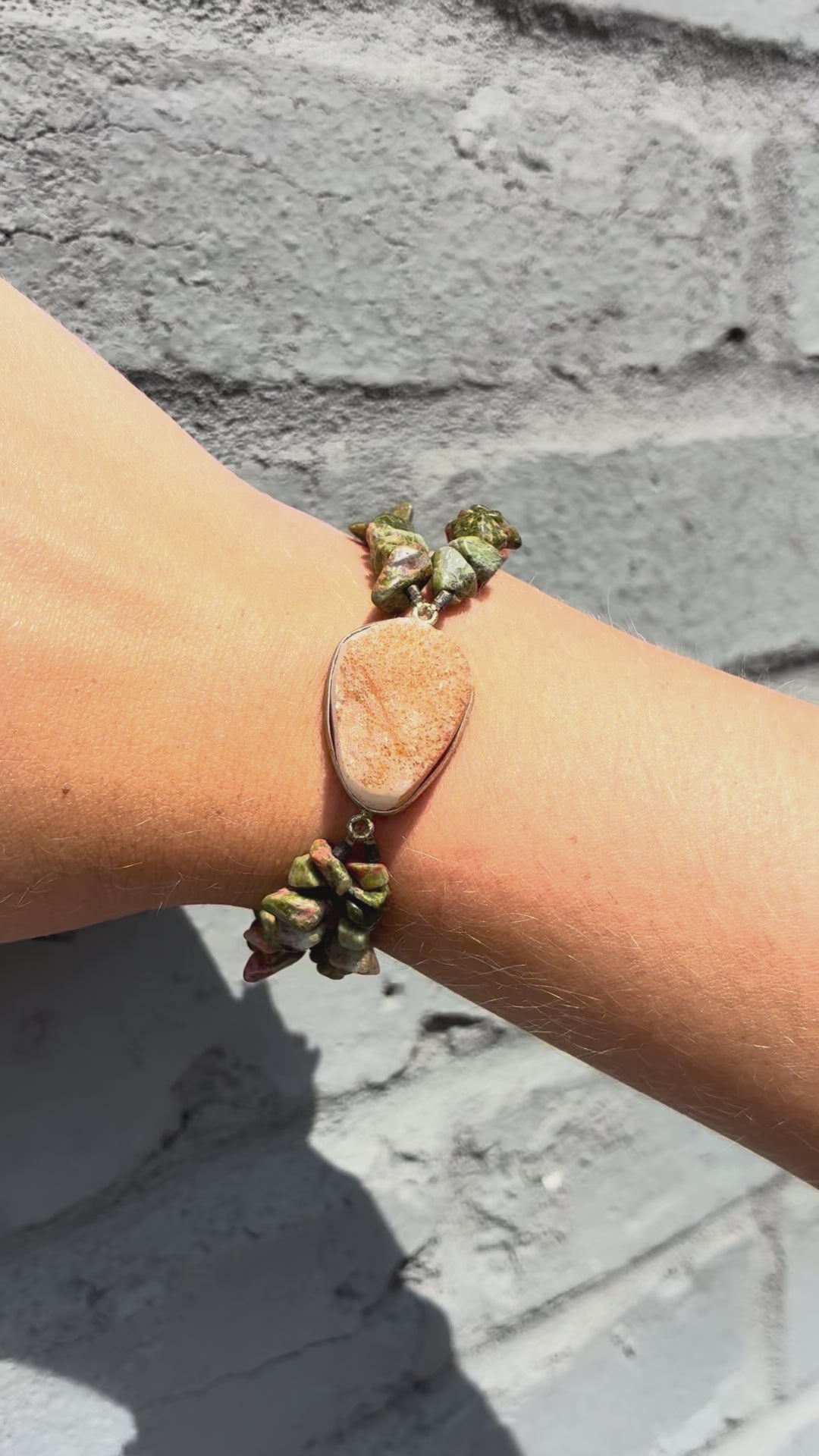 This earthy and sparkling double-strand bracelet combines the unique textures of orange druzy and unakite. A teardrop-shaped orange druzy stone serves as the focal point, its crystalline surface catching the light beautifully. Two strands of unakite chips, with their distinctive green and pink hues, complement the druzy, creating a harmonious blend of earthy tones and subtle sparkle. This bracelet is perfect for adding a touch of natural beauty and bohemian flair to any outfit.