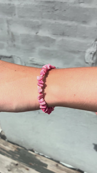 This striking jewelry set features a captivating wrap bracelet and a pair of large hoop earrings, both adorned with beautiful pink stones. The unique pattern of the stones adds a touch of personality and style to this statement set.