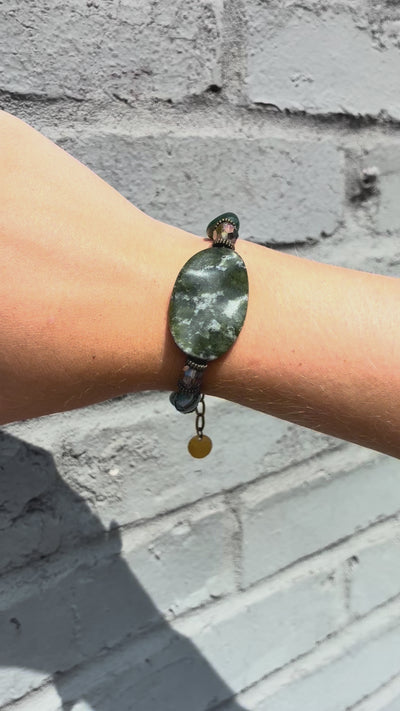This beautiful bracelet features a prominent oval tree jasper cabochon as its centerpiece, showcasing the stone's unique dendritic inclusions that resemble branches or trees. These natural patterns create a captivating and earthy aesthetic. The centerpiece is complemented by smaller beads, likely in coordinating earthy tones, enhancing the natural beauty of the jasper. This bracelet is perfect for adding a touch of nature-inspired elegance and bohemian flair to any outfit.