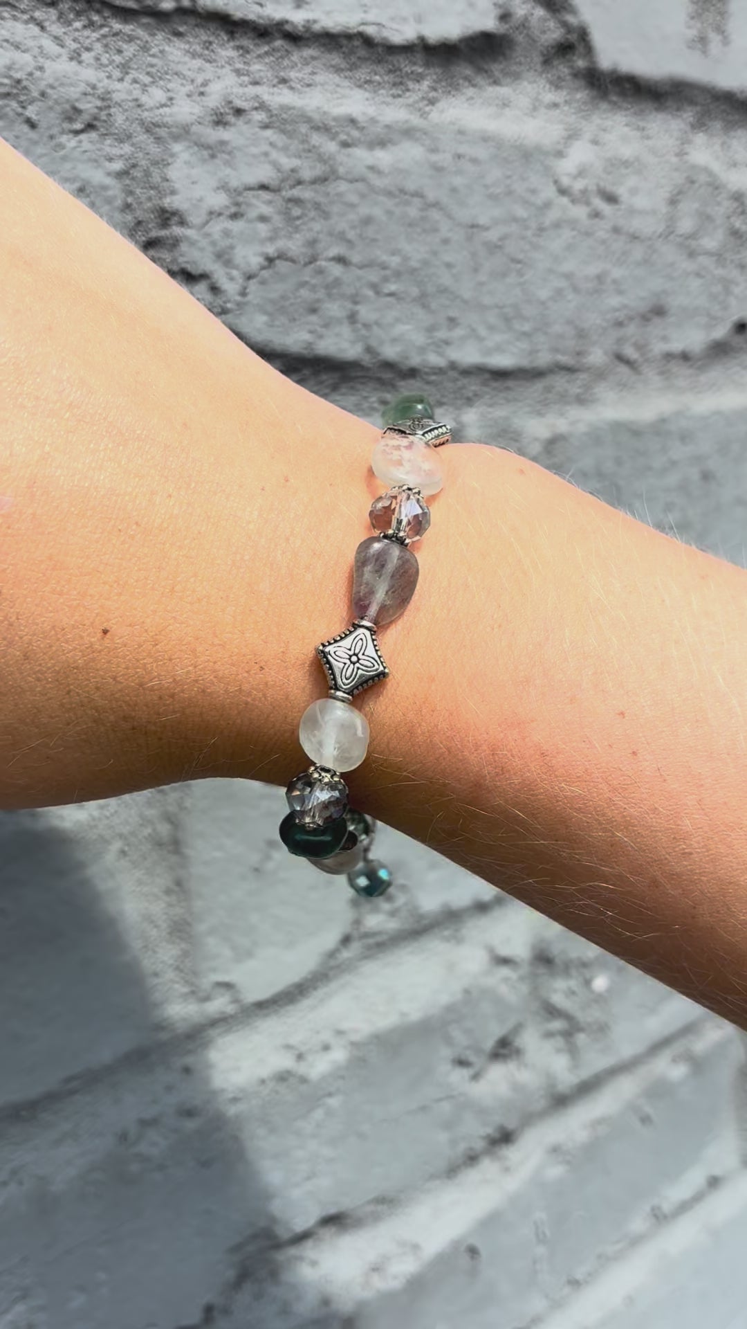 - The bracelet includes fluorite stones in shades of purple, green, and pink