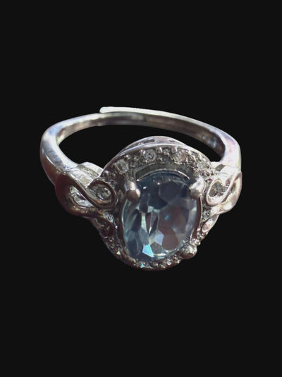 One-of-a-Kind Oval Blue Zircon Crystal Silver Ring with Intricate Halo Design (Adjustable)
