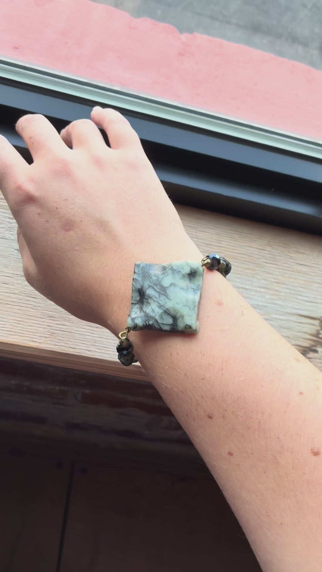 This striking bracelet features a captivating web agate centerpiece. The agate's unique patterns, resembling a spiderweb or network of veins, create a visually interesting and earthy focal point. The agate is complemented by black crystal stones and a gold-tone chain and clasp, adding a touch of elegance and contrast. This bracelet is perfect for adding a touch of natural beauty and sophisticated style to any outfit.